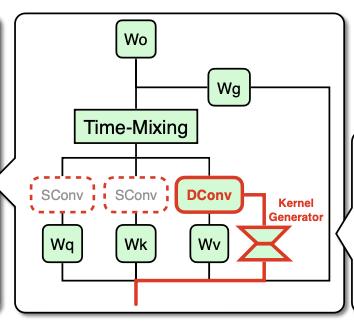 此模块使用一个卷积核生成器 (kernel generator),能够根据输入内容动态地生成因果卷积核 (dynamic causal convolution kernels),然后将这些卷积核应用于 V (值) 词元上。此外,它还移除了在 Q (查询) 和 K (键) 上的冗余静态卷积,从而简化了计算流程。
