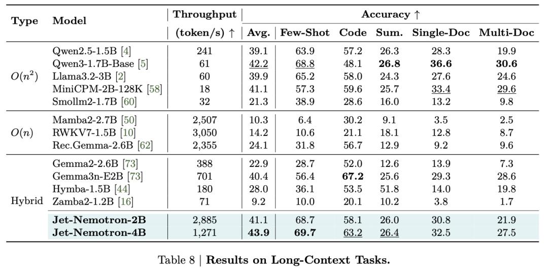 综合来看,Jet-Nemotron-2B和Jet-Nemotron-4B在这些领域的表现均与Qwen3-1.7B-Base相当,甚至更胜一筹。