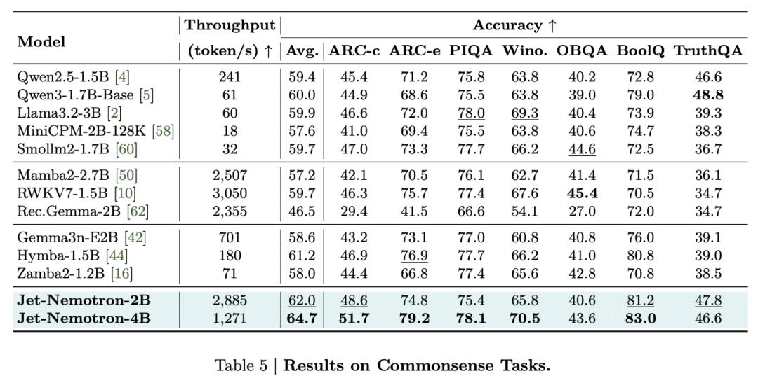 常识推理任务上,Jet-Nemotron-2B平均准确率达到62.0,超越所有基线模型。