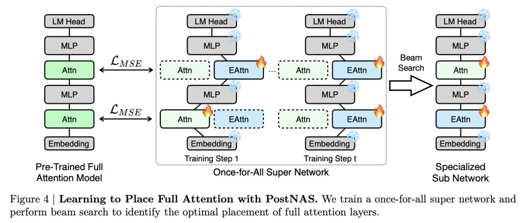 因此,研究团队引入了一种新方法,通过训练一个“一次性”超级网络 (once-for-all super network),自动学习应该在哪些位置使用全注意力层。