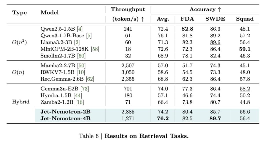 检索任务上,Jet-Nemotron-2B的表现优于除 Qwen3-1.7B-Base之外的所有基线模型。