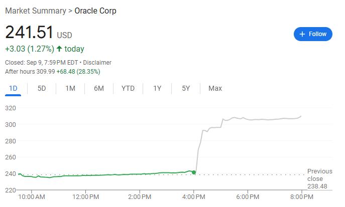 隔夜,甲骨文公司(Oracle)股价在盘后一度飙升超27%,创下互联网泡沫以来的最佳单日表现。