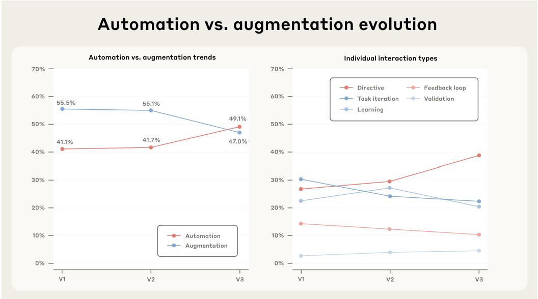 上面的统计简单说就是人们交给大模型的任务越来越高级,在向脱手的方向移动,并且第一次超过了把大模型当纯粹的工具。