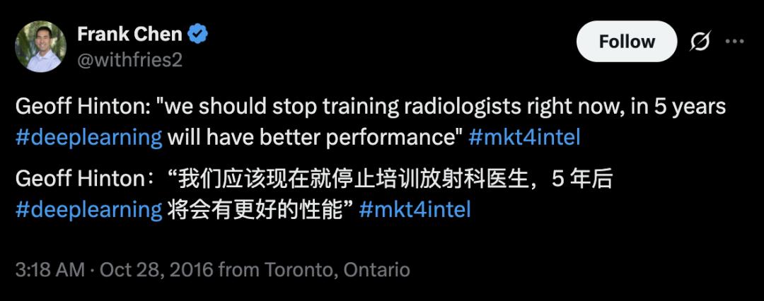 这也是Hinton在2016年提出「应停止培养放射科医生」这一观点的重要背景。