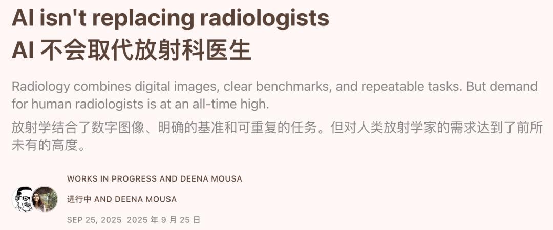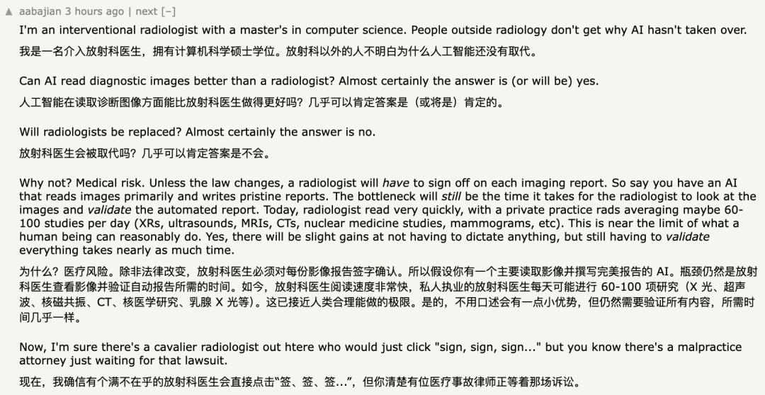 Hacker News中有一篇「对人类放射科医生的需求达到历史新高」热帖,一名放射科医生在下面留言:
