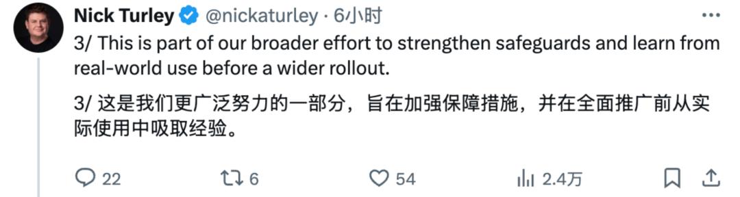 Nick Turley表示目前从默认模型切换到敏感模型只是临时性的。
