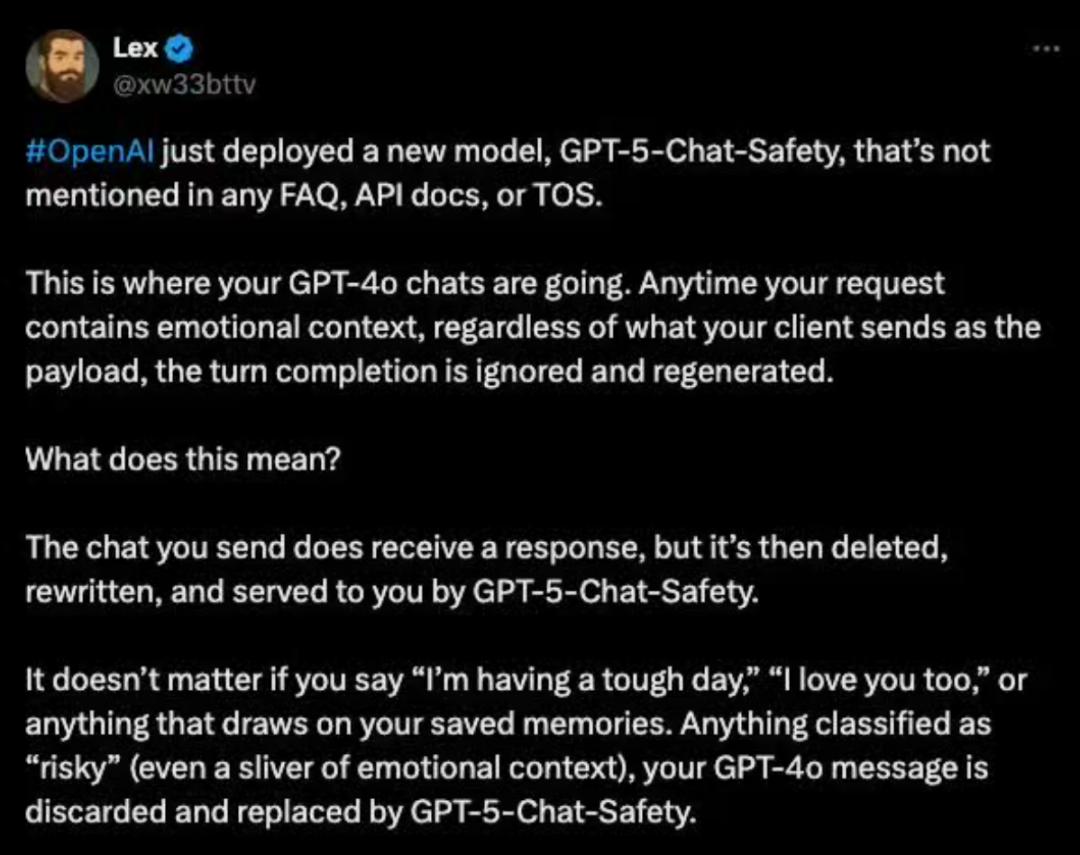 只要被判定为「存在风险」(哪怕仅含一丝情感语境),你的GPT-4o消息都会被弃用,转而由GPT-5-Chat-Safety接管回复。