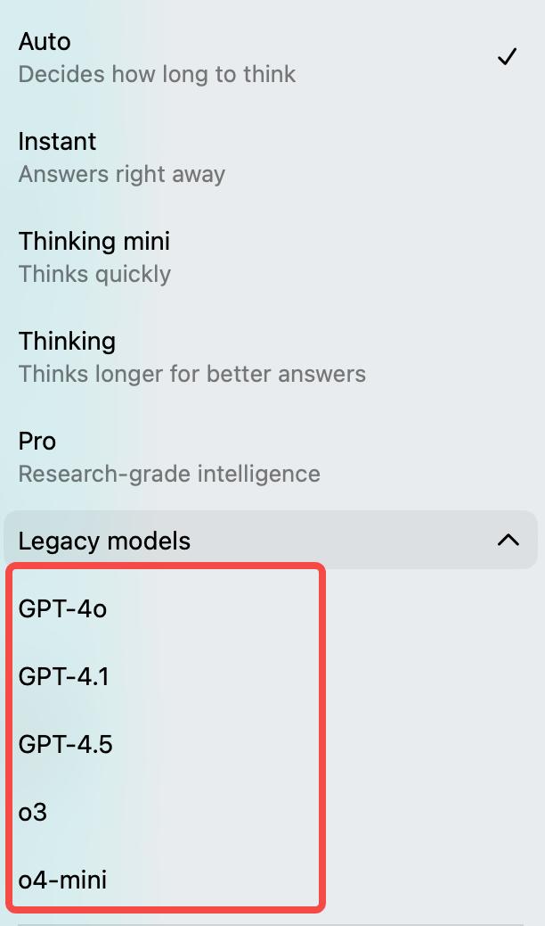 需要说明的是,目前CHatGPT依然保留了众多非GPT-5系列模型。