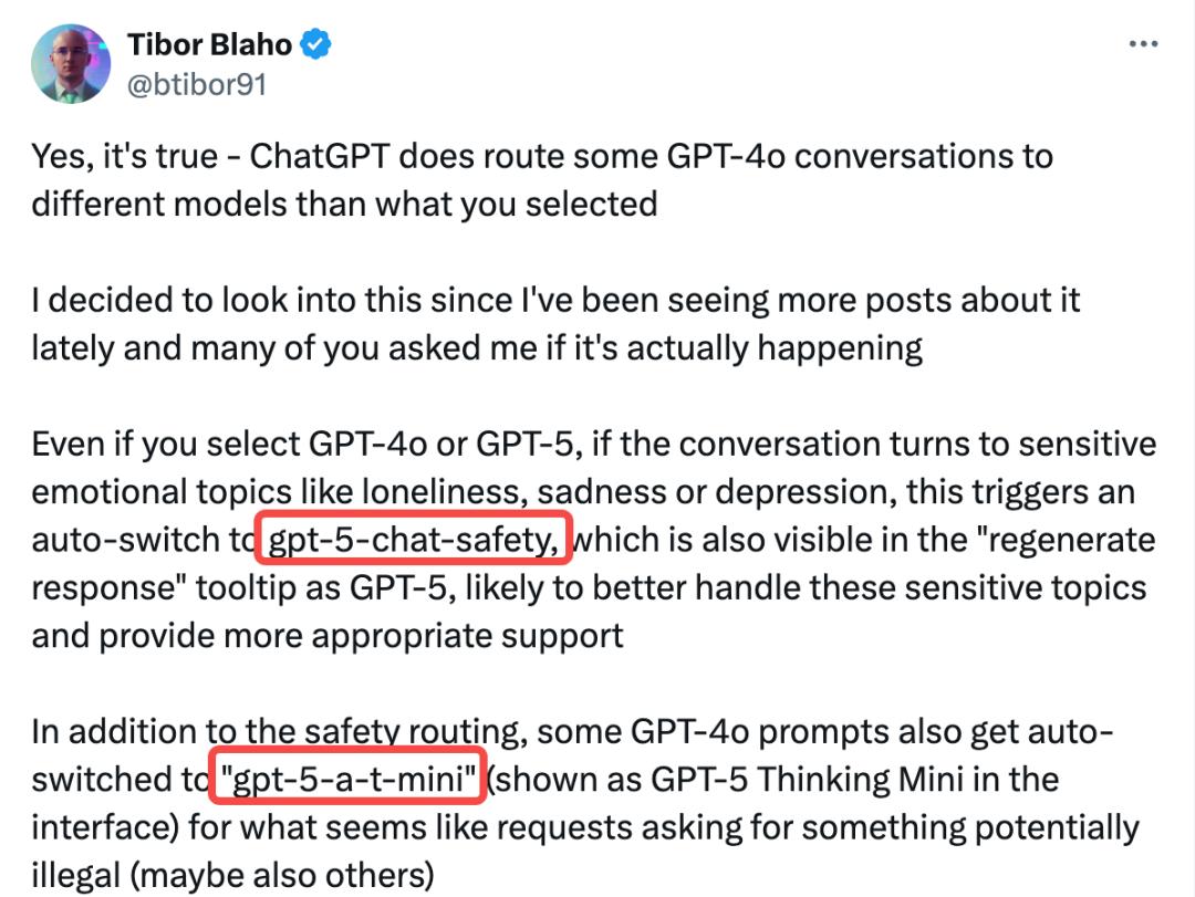 这验证了Tibor Blaho的说法,ChatGPT在你选择gpt-4o的前提下,擅自将模型「路由(更改)」到了「gpt-5-a-t-mini」。