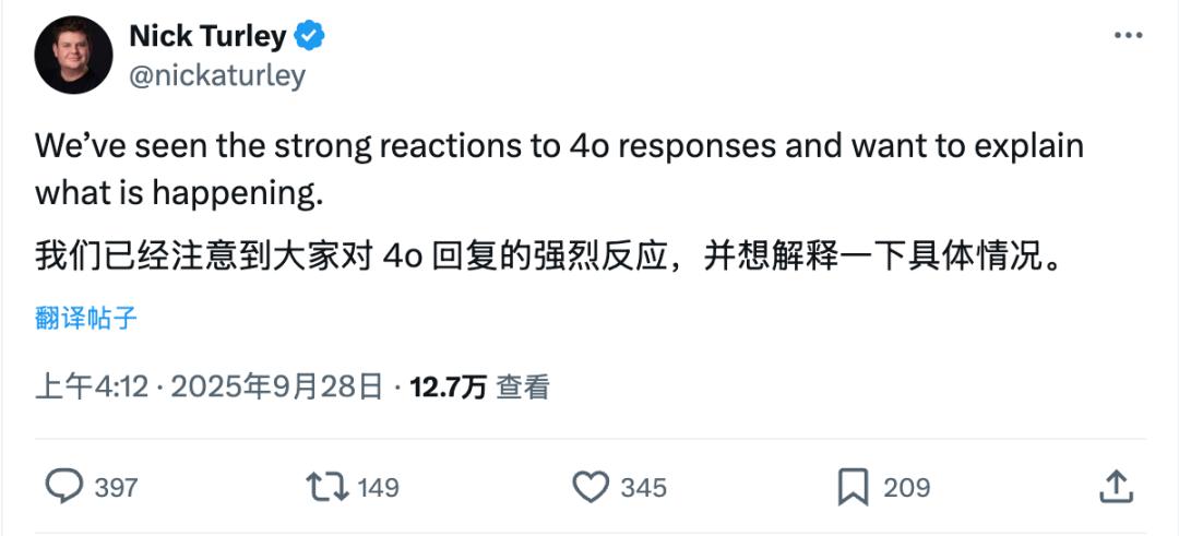 OpenAI的副总裁,兼ChatGPT APP主管Nick Turley在今天回应了网友们对此的「强烈反应」。