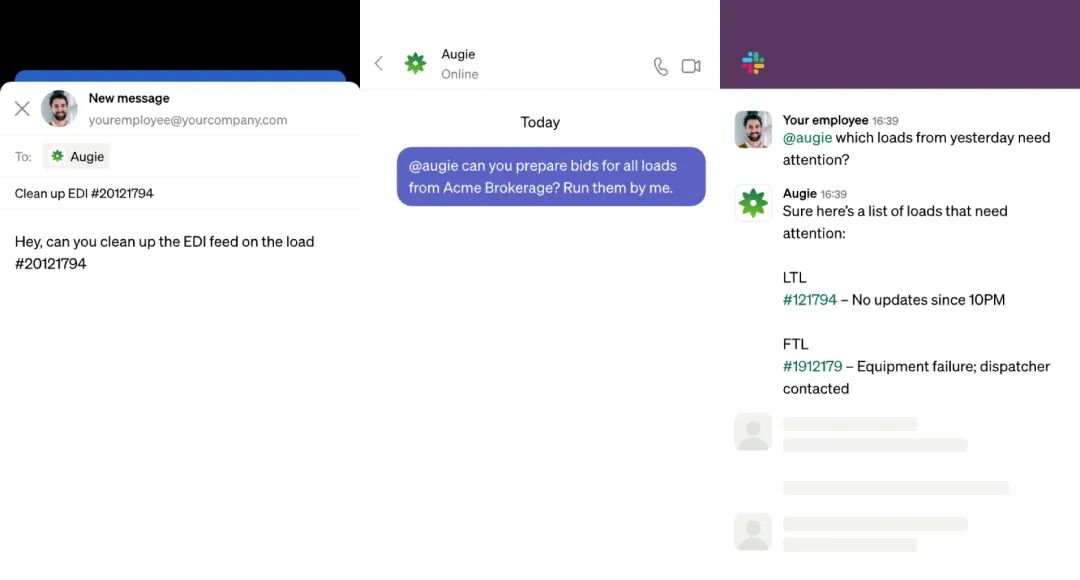 运输途中,以前操作员要不停打电话问司机“到哪了”,或者催仓库确认进度。Augie可以定时发邮件、打电话、发消息,把这些例行沟通全接手。