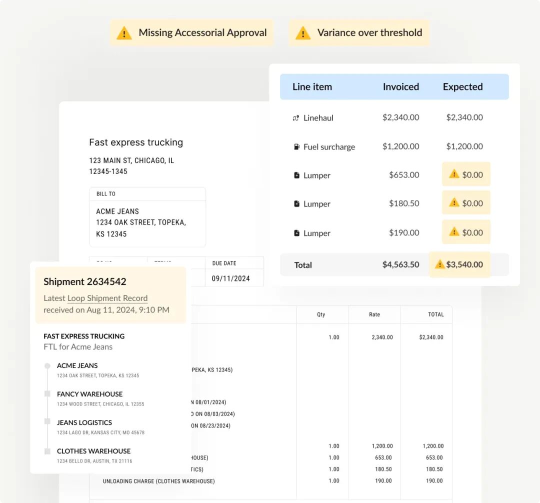 Loop把这个环节“AI化”了。它能自动识别各种格式的发票、凭证、费率表,把里面的关键数据提出来,快速和系统里的标准里程、费用去比对。如果发现有异常,比如多报了一笔附加费,它会自动标记出来。整个过程几乎是实时的,不用人反复对照。