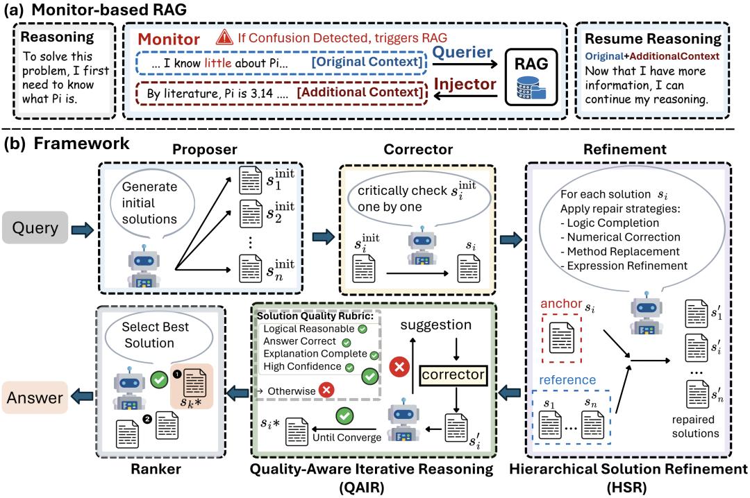 在这个开源底座上,研究团队通过叠加Monitor-based RAG(隐式知识增强)、HSR(分层解法修复)、QAIR(质量感知迭代推理)三大创新机制,实现了质的飞跃。