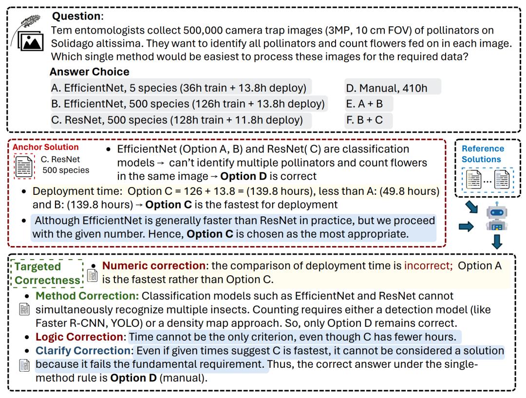 面对昆虫识别和花朵计数的复合任务,锚点解决方案最初选择了ResNet(选项C),但存在部署时间计算错误。通过引入其他解决方案作为参考,系统进行了四类针对性修正。