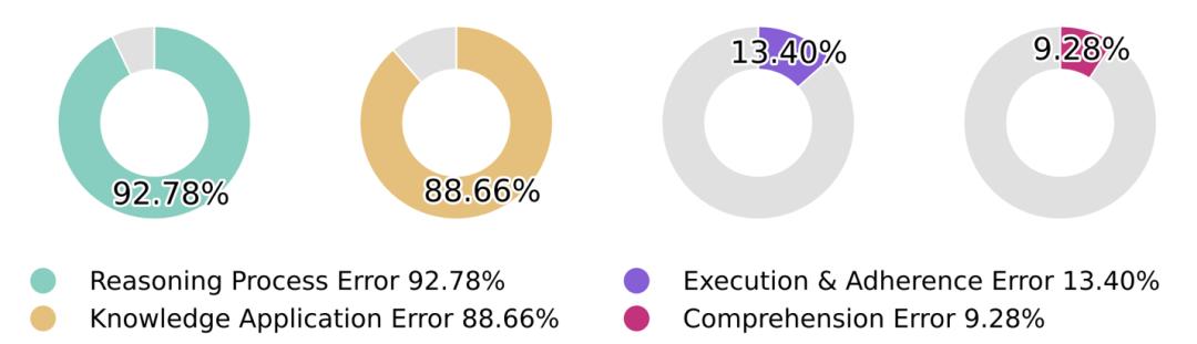 Figure 7的饼图揭示了一个关键洞察:92.78%的错误涉及推理过程问题,88.66%涉及知识应用问题,且两者存在大量重叠。