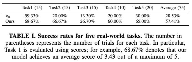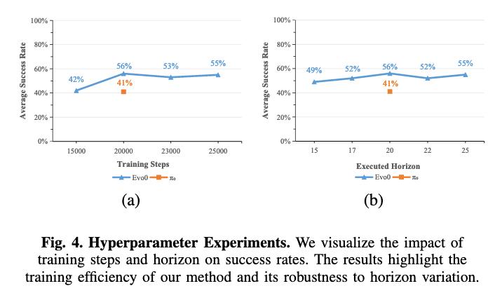 值得注意的是,仅用15k步训练的Evo-0已经超过了用20k步训练的π0,这表明Evo-0具有更高的训练效率。