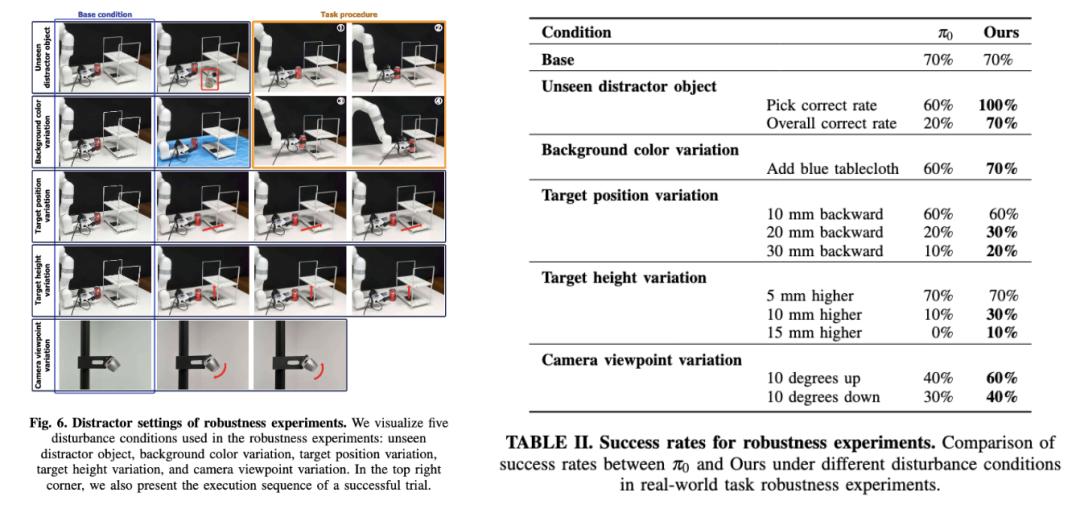 在鲁棒性实验中,论文设计了5类干扰条件:(1)引入一个未见过的干扰物体,(2)背景颜色的变化,(3)目标位置的位移,(4)目标高度的变化,(5)相机角度的变化。Evo-0均有相对鲁棒的结果,并且强于基准pi0。