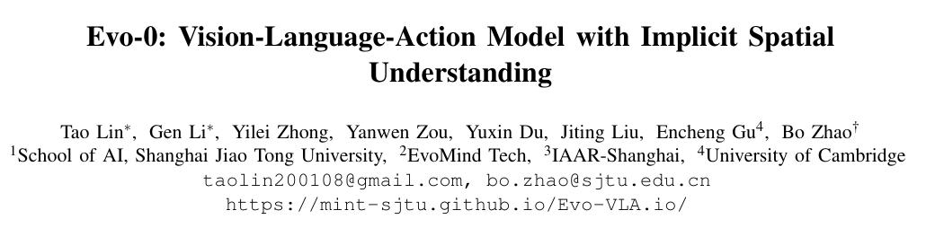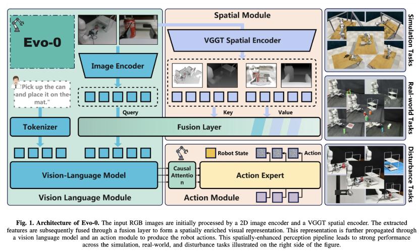 为此,上海交通大学和剑桥大学提出一种增强视觉语言动作(VLA)模型空间理解能力的轻量化方法Evo-0,通过隐式注入3D几何先验,无需显式深度输入或额外传感器。