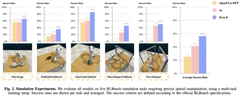 在rlbench仿真实验中,Evo-0在5个需要精细操作的任务上,平均成功率超过基线pi0 15%,超过openvla-oft 31%。