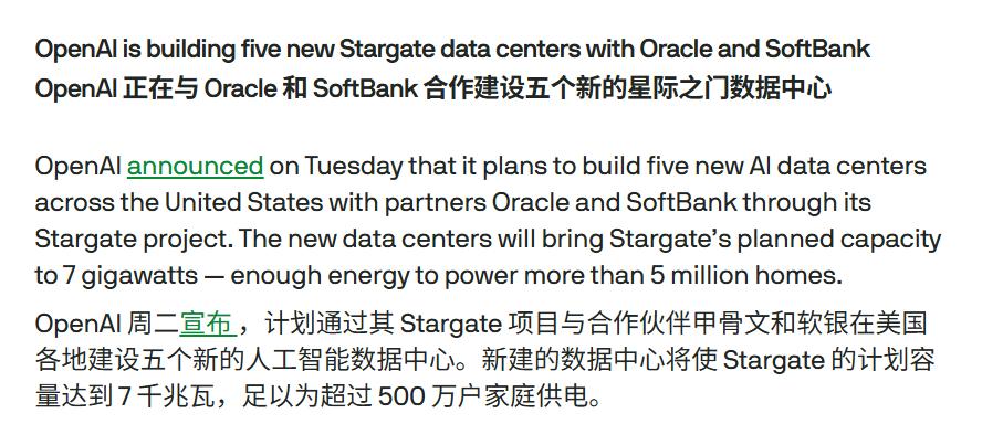 就在 9月 23 日,OpenAI 联合 Oracle、软银一起宣布, 将在美国新增五个大型 AI 数据中心,分布在得克萨斯、新墨西哥、俄亥俄等州,三年内投资超过 4000 亿美元。 到 2025 年底,整个 Stargate 计划的算力总量将达到 10GW(相当于一个中等规模国家的总发电量)。