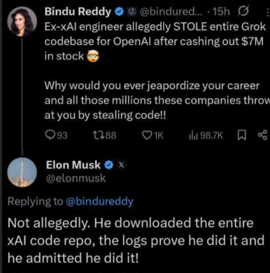 马斯克在X平台上愤怒指责,李学晨在离职前下载了xAI的整个代码库!登录日志证明了这一点,而他也承认了!