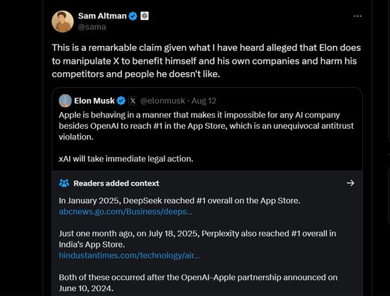 奥特曼则毫不留情地回击称,“考虑到我听说过的那些马斯克为了让X和他旗下公司获益、打击竞争对手和他不喜欢的人而采取的操纵行为,这种指控真是令人匪夷所思。”