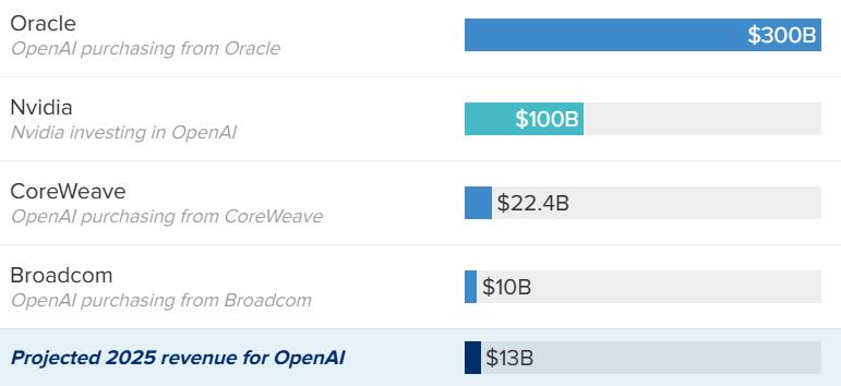 9 月末,Nvidia 宣布向 OpenAI 注资 1000 亿美元的消息,让纳斯达克与标普 500 指数创下历史峰值。这距离 OpenAI 与 Oracle 达成 3000 亿美元的 "星际之门"(Stargate)合作协议仅过去两个月,而在此之前,CoreWeave 刚刚将其 AI 基础设施供应额度从 119 亿美元翻倍至 224 亿美元。在这场算力军备竞赛中,OpenAI 的交易清单正以百亿级单位快速拉长。
