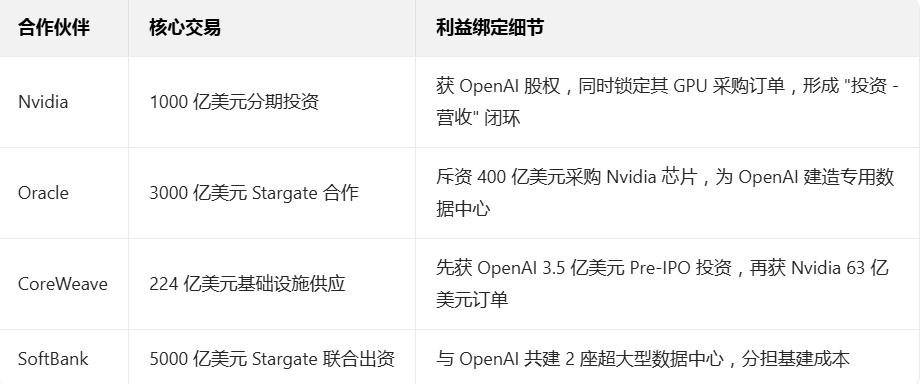 OpenAI 的交易网络早已超越简单的商业合作,形成了一张利益深度捆绑的生态网。从芯片巨头到云计算服务商,每个参与者都既是供血者也是受益者,构成了独特的 "风险共同体"。