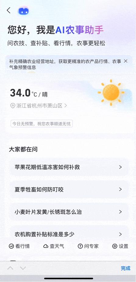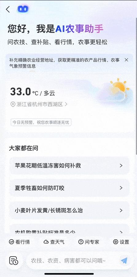 气象专家。AI能识别农户的定位,提供精确到乡镇的气象信息。当遇到极端气象或者台风、洪水、干旱等农活相关的灾害时,能提供智能预警,减少损失。