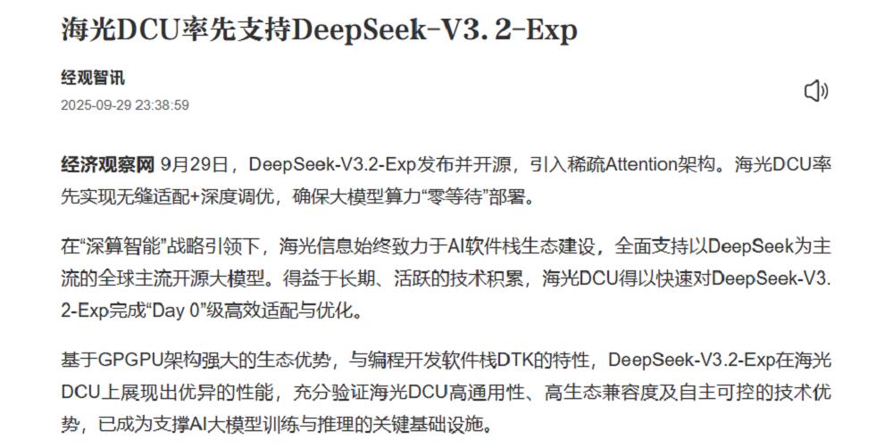 据经济观察网报道,海光信息的DCU(深度计算处理器)率先实现了对DeepSeek-V3.2-Exp的Day 0级高效适配与优化,确保大模型算力“零等待”部署。