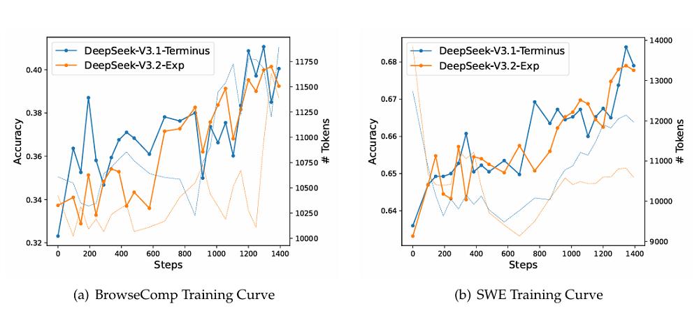 完成预训练后,DeepSeek-V3.2-Exp又通过专家蒸馏和混合强化学习进行后训练。专家蒸馏的思路是针对数学、编程、推理等不同领域训练专门的专家模型,然后将这些模型的知识压缩进通用模型。