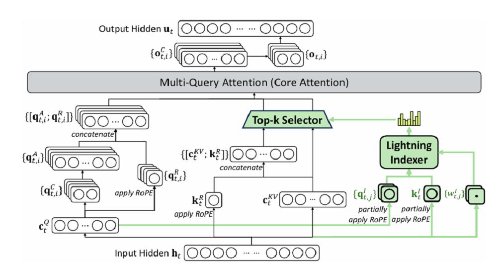 Lightning Indexer能够快速评估查询token与历史token的相关性,从选择机制只挑选最相关的一部分上下文进入注意力计算,这让复杂度从传统的二次方降到了近似线性水平,大幅降低了训练和推理的成本。