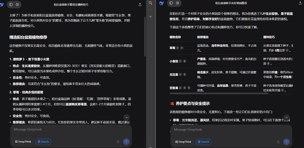 与DeepSeek-V3.1-Terminus(左)相比,DeepSeek-V3.2-Exp(右)的生成结果更为简短,用词也比较“朴素”。并且,DeepSeek-V3.2-Exp推荐的无花果、百香果等植物,需要进行扦插、高频率养护等操作,并不符合提示词要求的新手友好。