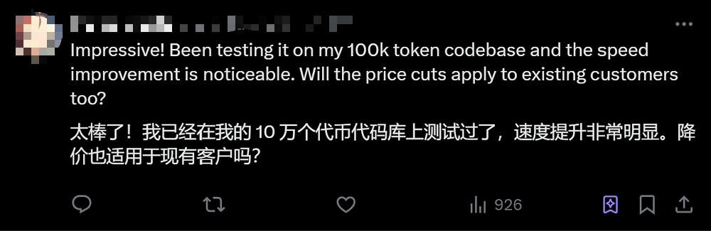 在DeepSeek官宣DeepSeek-V3.2-Exp开源的推文中,有不少网友分享了对模型的使用体验和感受。有位网友称,自己在10万个token的代码库上测试了DeepSeek-V3.2-Exp,速度提升非常明显。