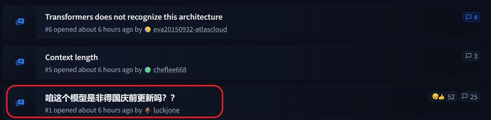 Hugging Face上,DeepSeek-V3.2-Exp的社区板块也有不少讨论,不过,关注度最高的一条帖子,是来自中国网友的“吐槽”:“咱这个模型是非得国庆前更新吗?”