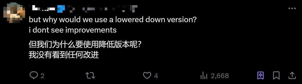 这也得到了其他网友观点的印证,例如,这位网友便在x平台发贴称,并没在这款模型上看到改进,并提出质疑:我们为什么要使用能力降级的模型呢?