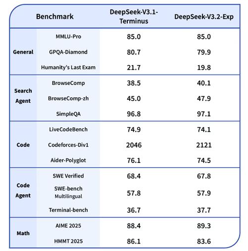 DeepSeek-V3.2-Exp是在DeepSeek-V3.1-Terminus的基础上打造的。在各领域的公开评测集上,两款模型的表现基本一致,不过,DeepSeek-V3.2-Exp完成任务使用的token量大幅度减少。