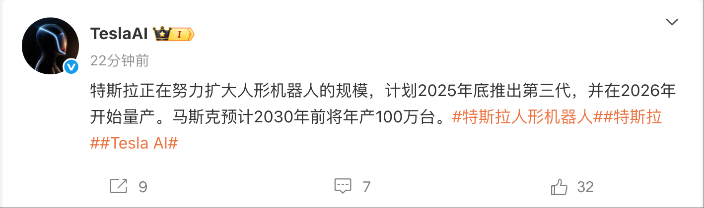 凤凰网科技讯 9月30日,特斯拉官方宣布,特斯拉正在努力扩大人形机器人的规模,计划2025年底推出第三代,并在2026年开始量产。马斯克预计2030年前将年产100万台。