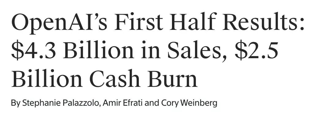 2025 年上半年,OpenAI 净亏损达 135 亿美元,其中结构性成本占比超七成,成为吞噬利润的主要因素。在研发投入上,为推进 GPT-5 等核心技术攻坚,其研发支出飙升至 67 亿美元,占上半年营收的 156%,这一比例远超行业平均水平,凸显出 AI 技术研发的 “无底洞” 特性。