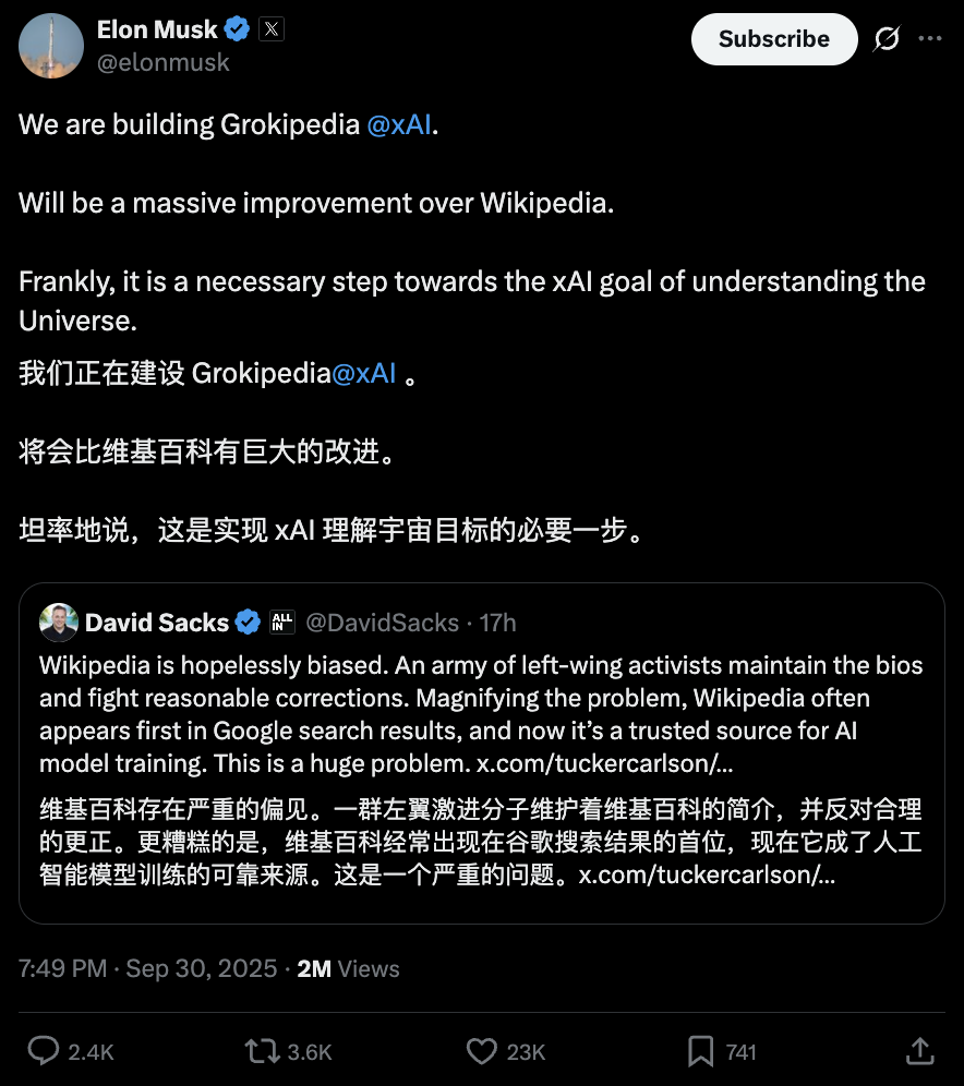 马斯克宣布正面挑战维基百科,即将推出Grokipedia