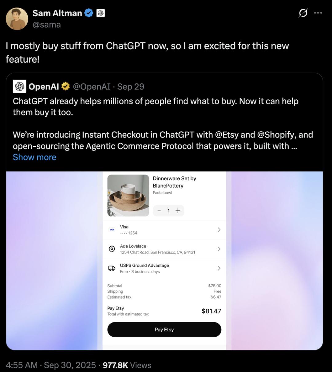首先是电商购物,ChatGPT 正在把「问答」转化为「交易」。在近期的更新中,Open AI 在美国上线了「Instant Checkout」,与 Etsy 合作,用户可以在对话里直接完成商品发现、下单与支付,Shopify 也即将接入,支付环节由 Stripe 提供。