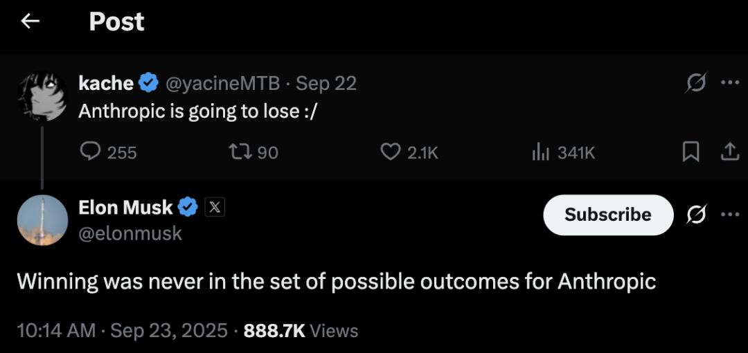 比如马斯克,他今年 9 月在自己执掌的 X 平台上表示,「对于 Anthropic 来说,获胜从来都不在可能的结果范围内。」