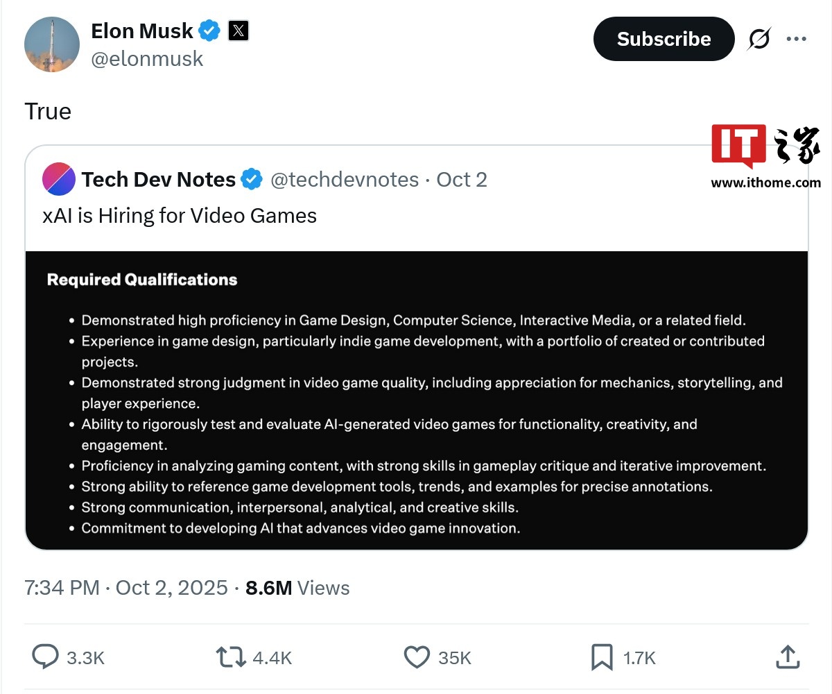 IT之家 10 月 3 日消息,埃隆・马斯克北京时间昨日在其持有的 xAI 下属社交媒体平台 X 确认,xAI 正在招募游戏开发者。