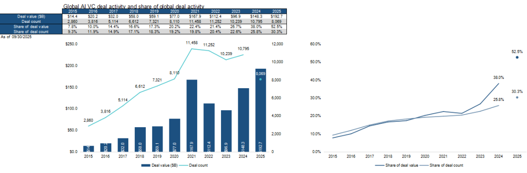 这一幕也预示着,2025 年有望成为首个 VC 资金半数以上流向 AI 行业的年份。