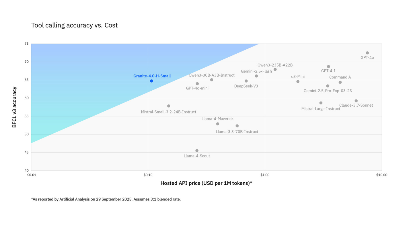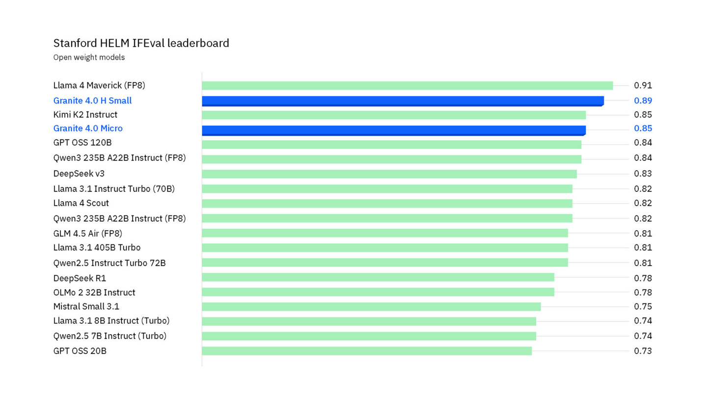 IBM 表示混合架构的设计能在长输入和多并发场景下减少 70% 的内存需求。性能方面,即使是最小的 Granite 4.0 模型在基准测试中也明显优于 Granite 3.3 8B,而 Granite-4.0-H-Small 则以较小参数规模取得了开源模型中一流的表现。
