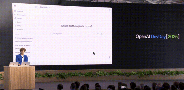 最最重磅的,还是Apps SDK,所有人皆可在ChatGPT中构建原生应用,其意义堪比2023年首发的GPTs。