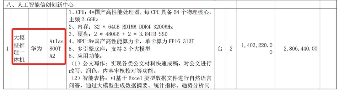 其中,人工智能信创创新中心采用2台华为大模型推理一体机,搭载Atlas 800T A2,合计报价约281万元。
