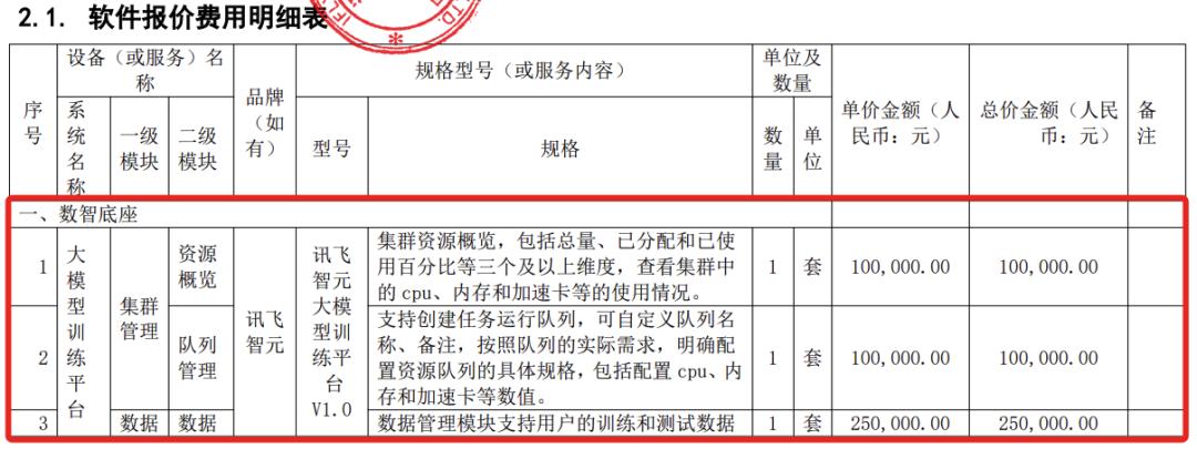 列举几个平台的报价,可以作为大模型落地行情的参考。其中核心的大模型训练平台采用的是讯飞智元大模型训练平台V1.0,报价228万元;智能体平台为星火智能体平台V1.0,报价250万元;大模型运行平台为讯飞智元算法模型纳管平台V1.0,报价145万元。