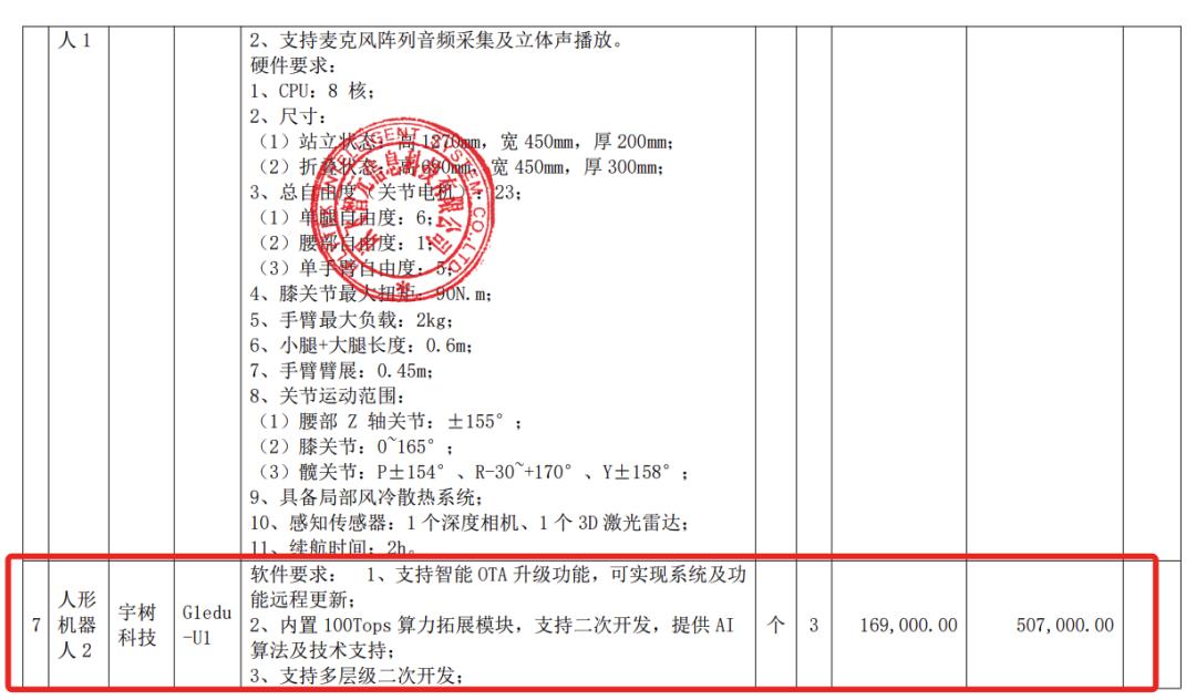 其中,宇树科技人形机器人Unitr ee G1采购3台,单价为9.9万元;宇树科技人形机器人G1edu -U1采购3台,单价为16.9万元。
