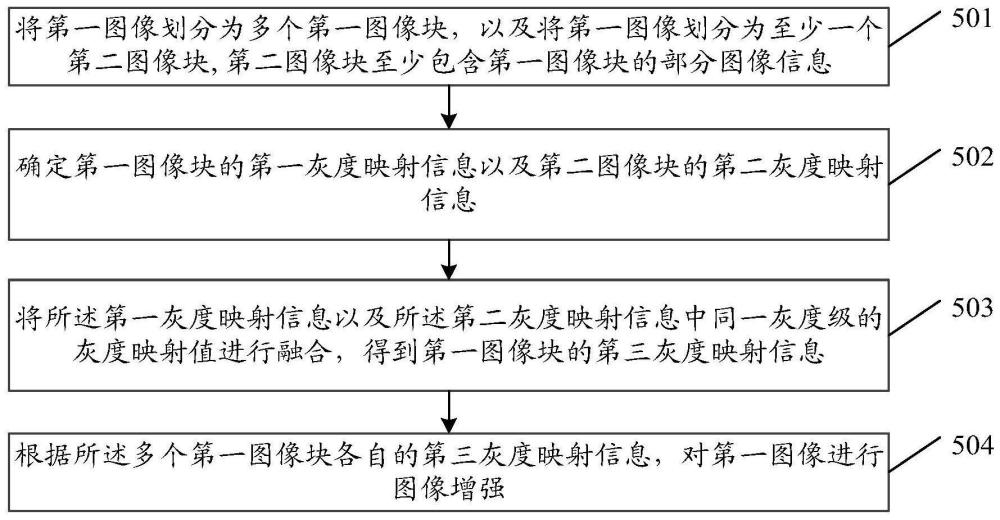 本申请提供了图像处理方法及装置、设备、存储介质;其中,所述方法包括:将第一图像划分为多个第一图像块,确定所述第一图像块的第一灰度映射信息;将第一图像划分为至少一个第二图像块,其中所述第二图像块至少包含所述第一图像块的部分图像信息,确定所述第二图像块的第二灰度映射信息;将所述第一灰度映射信息以及所述第二灰度映射信息中同一灰度级的灰度映射值进行融合,得到所述第一图像块的第三灰度映射信息;根据所述多个第一图像块各自的第三灰度映射信息,对所述第一图像进行图像增强。